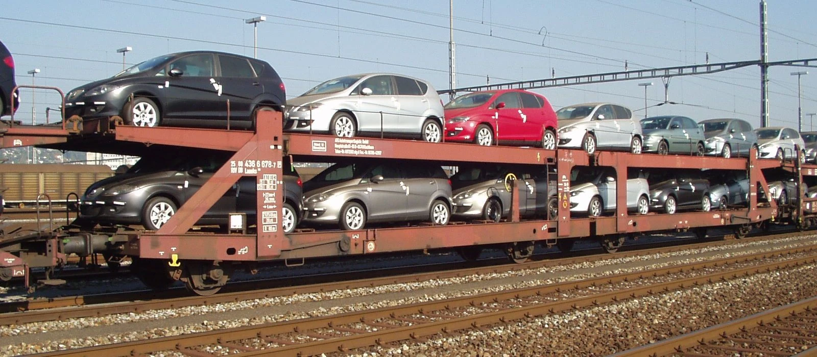 An Autorack (also known as an auto carrier or a car transporter) is a specialised piece of rollingstock used to transport automobiles and light commercial vehicles. Car carriers are used to transport vehicles between factories and distribution centers, and can also be used on passenger trains, to transport passengers cars.